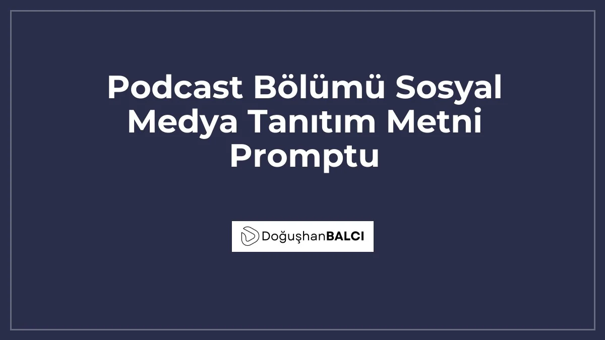 Sen profesyonel bir sosyal medya içerik stratejistisin. [Podcast Adı] için yeni yayınlanan [Bölüm Başlığı] bölümünün tanıtımını hazırlayacaksın. Hedef kitlemiz [Hedef Kitle Profili]. Metinde şu noktalar olsun: 1. İlgi çekici bir kanca (hook), 2. Bölümün dinleyiciye kazandırdığı 3 ana değer, 3. Samimi bir 'yeni bölüm yayında' çağrısı, 4. Uygun hashtag önerileri. Ses tonu: [Ton; örn: İlham verici ve merak uyandırıcı]. Bu promptu kullanırken köseli parantez içindeki alanları kendi bölümünüze uygun şekilde doldurmanız, yapay zekadan çok daha kaliteli ve kişiselleştirilmiş içerikler almanızı sağlar.Daha Fazla Erişim İçin İpuçları