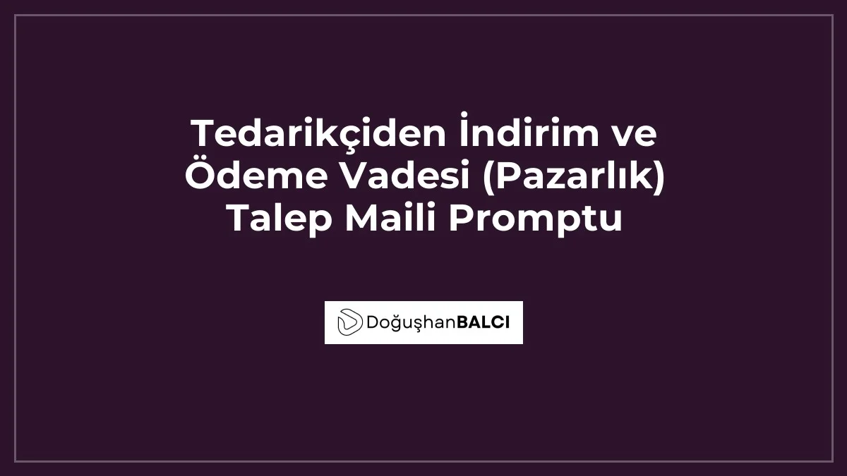 Sen profesyonel bir satın alma uzmanısın. [TEDARİKÇİ İSMİ] şirketine gönderilmek üzere, [ÜRÜN/HİZMET] alımımız için %10 fiyat indirimi ve mevcut 30 günlük ödeme vademizin 60 güne çıkarılmasını talep eden, ikna edici ve resmi bir mail taslağı hazırla. Mailde, geçmişte yaptığımız düzenli ödemelere vurgu yap, gelecek dönemde iş hacmimizi %20 artırma potansiyelimizin olduğunu belirt ve nazik bir dille revize talebimizi ilet.Yukarıdaki promptu ChatGPT veya benzeri araçlara yapıştırarak saniyeler içinde özelleştirilmiş mailler elde edebilirsiniz. Değişkenleri doldururken gerçekçi veriler kullanmak, mailin başarısını doğrudan etkileyecektir. Her zaman maili göndermeden önce mutlaka kendi üslubunuza uygun şekilde üzerinden geçin ve kurumsal kimliğinizi yansıttığından emin olun.
